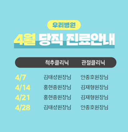 ¾È³çÇϼ¼¿ä. 4¿ù ´çÁ÷ Áø·á¸¦ ¾È³»ÇØ µå¸³´Ï´Ù. Åä¿äÀÏ ´çÁ÷ Áø·á´Â ¾Æ·¡¿Í °°½À´Ï´Ù. °¨»çÇÕ´Ï´Ù.