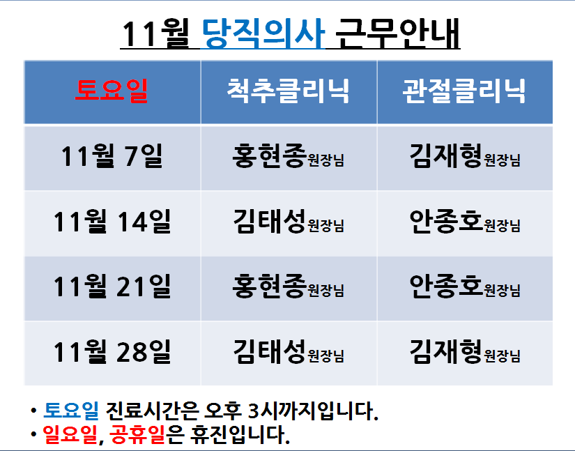 2020³â 11¿ù Åä¿äÀÏ ´çÁ÷ÀÇ»ç ±Ù¹«¾È³»ÀÔ´Ï´Ù.
