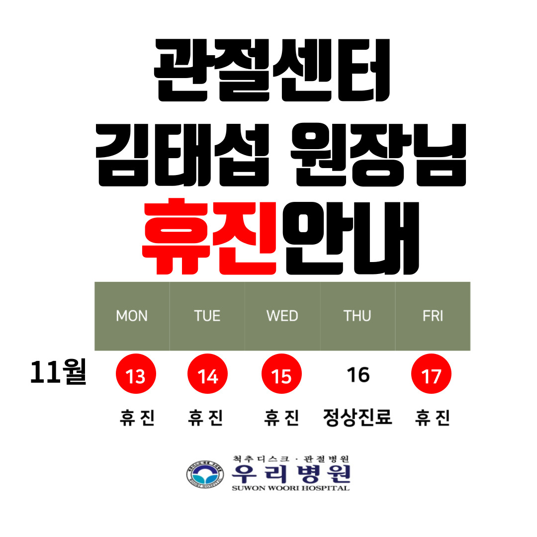 < ±éż· ¿øÀå´Ô ÈÞÁø ¾È³»ÀÔ´Ï´Ù.> 11¿ù 13ÀÏ ºÎÅÍ 15ÀÏ ±îÁö ÈÞÁø 11¿ù 16ÀÏ Á¤»óÁø·á 11¿ù 17ÀÏ ÈÞÁø * È®ÀÎÇϽðí Áø·á¿¡ Âø¿À ¾øÀ¸½Ã±æ ¹Ù¶ø´Ï´Ù.